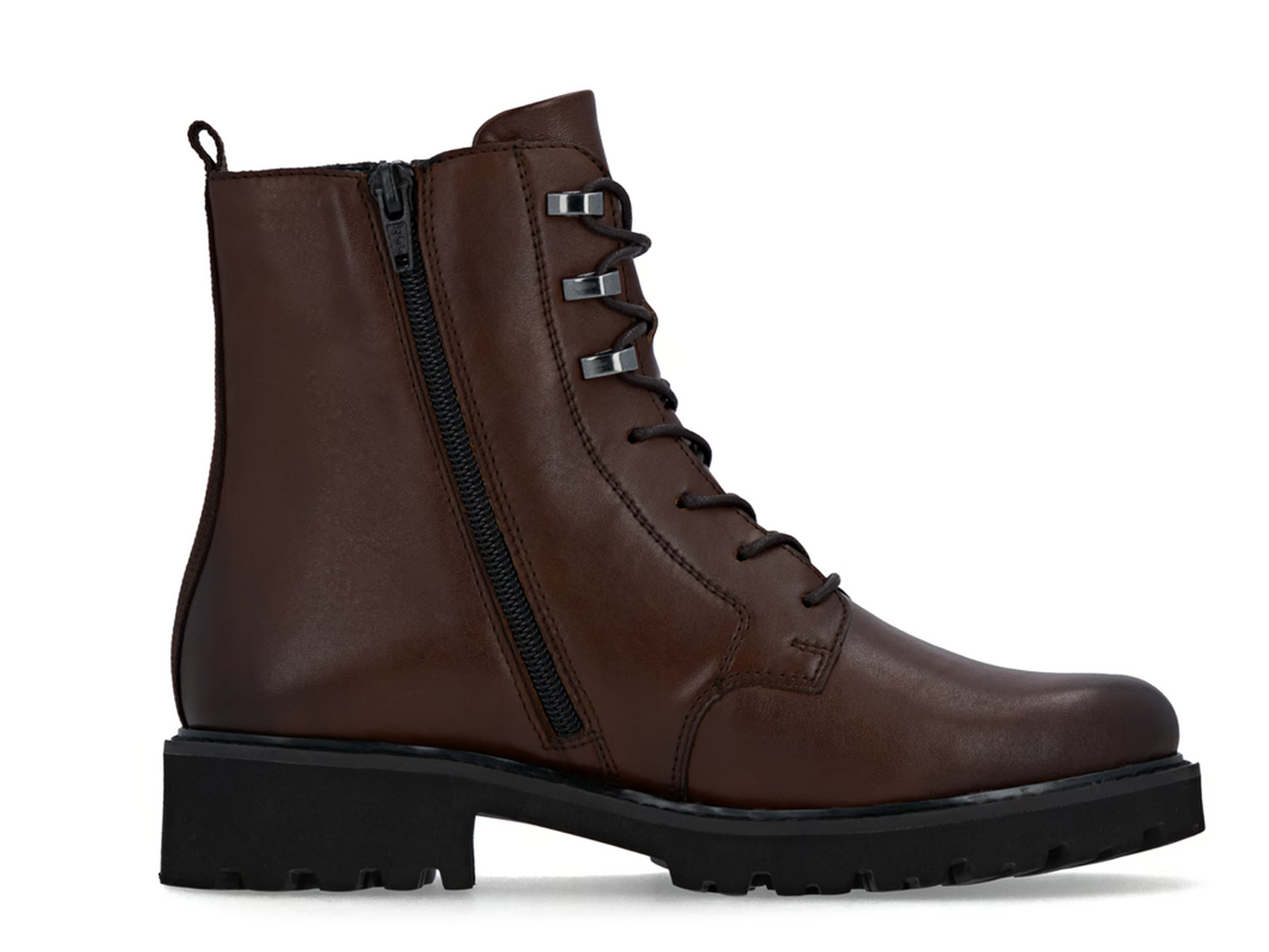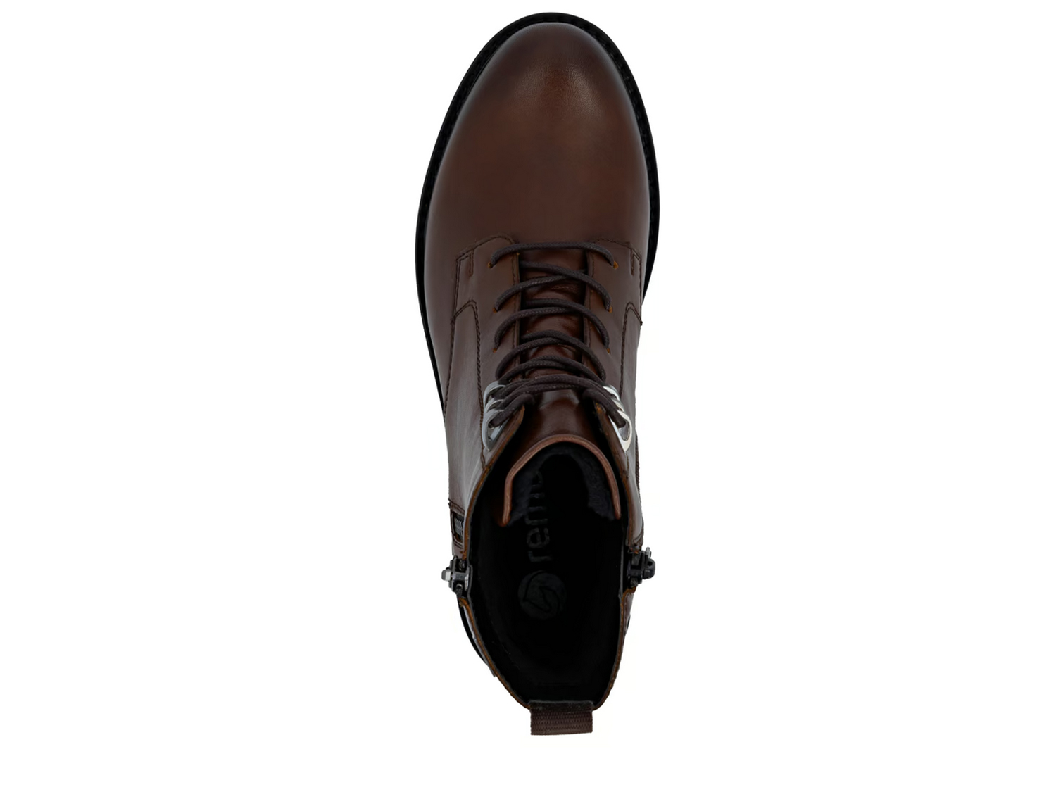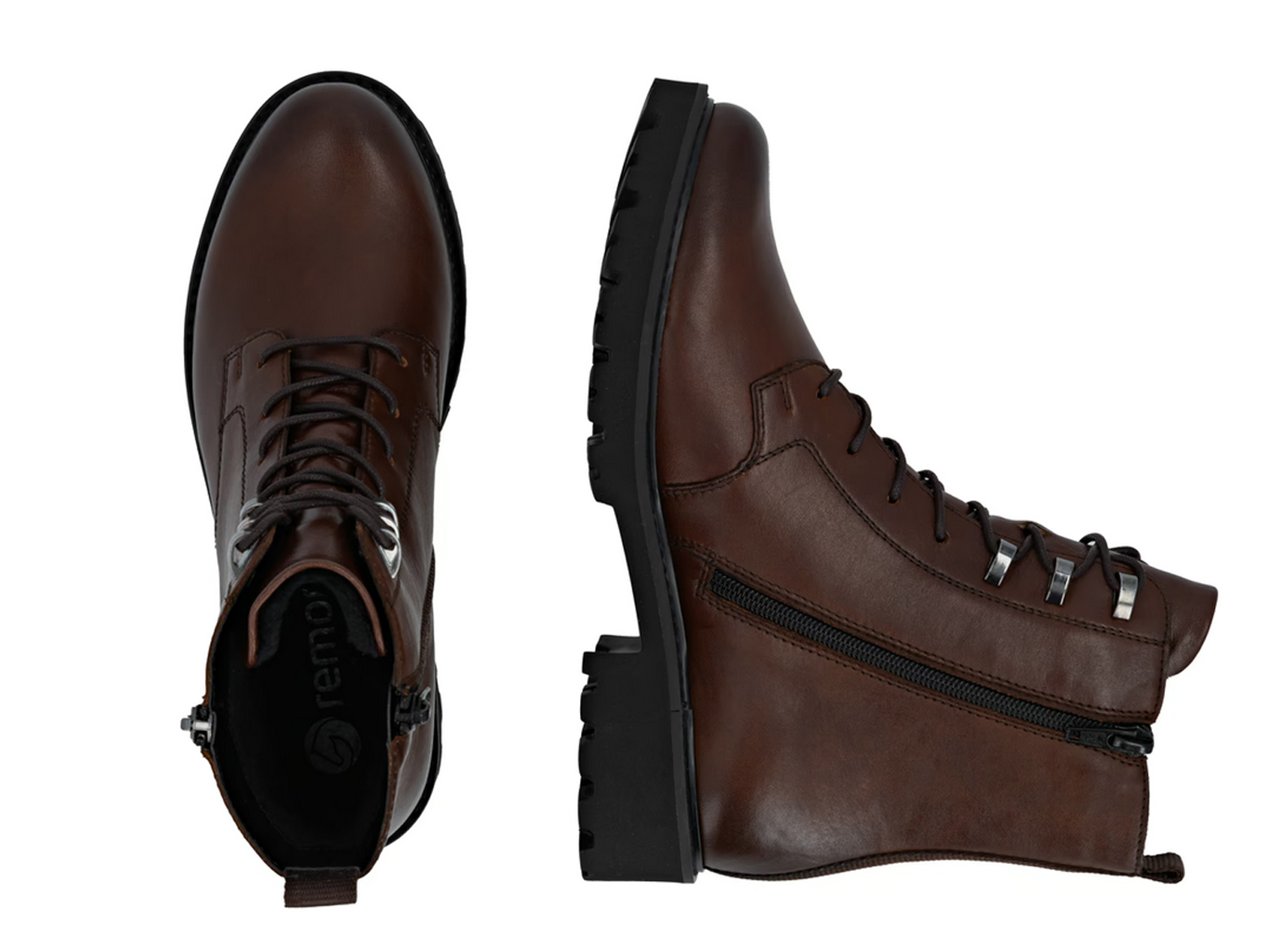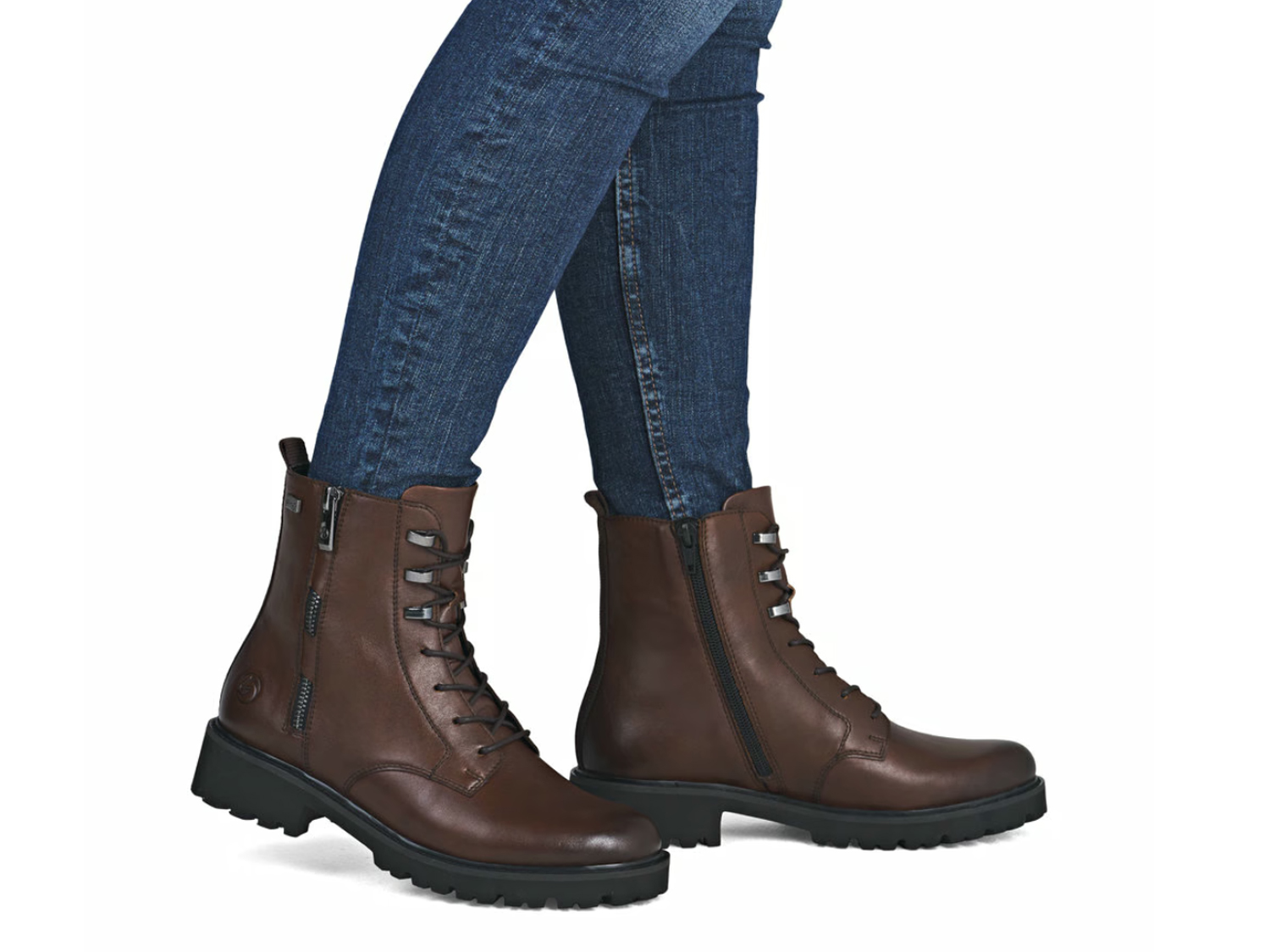 Hipper Zipper: Diese braunen remonte Schnürstiefel für Damen aus Glattleder strahlen feminines Selbstbewusstsein aus. Trotz Schnürung kann der Schuh ganz einfach mit einem Reißverschluss geschlossen werden. Für ein angenehmes Tragegefühl sorgt die remonte Lite n Soft Technologie mit ihrer ultra leichten Sohle und der gepolsterten und herausnehmbaren Einlegesohle. Das Modell sichert dem Fuß zusätzlichen Bewegungsfreiraum, denn es ist in Komfortweite geschnitten. Die Schnürstiefel sind dank remonteTEX-Technologie wasserabweisend und damit bei jedem Wetter die richtige Wahl. Das heißt: Endlos schlendern ist überhaupt kein Problem!